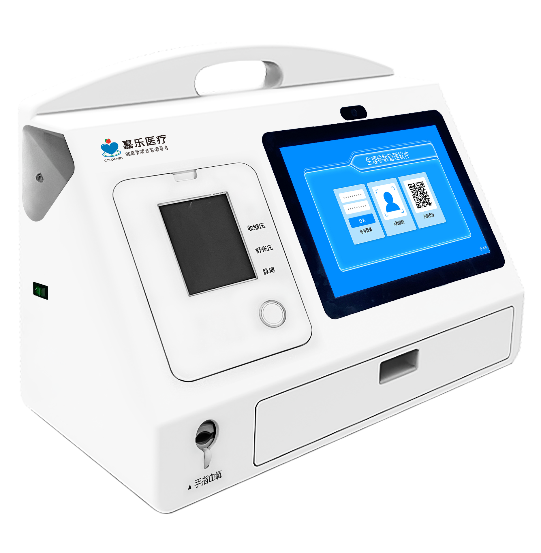 标配检测功能:血压、脉率、体温、血氧、血流灌注指数、心电(6-12导)、血糖、尿酸、胆固醇、尿液分析。可扩展功能:身高体重、肺功能...产品特点移动方便:手提式便携携带;身份识别:二代身份证(IC卡)、手机、微信扫码、人脸;操作显示:电容触摸操作;操作指引:视频动画、语音引导,操作简单自助;人脸识别:高清摄像头,人脸识别登录 ;健康报告:热敏快速自动打印;系统管理:支持用户设置、登录设置、用户管理